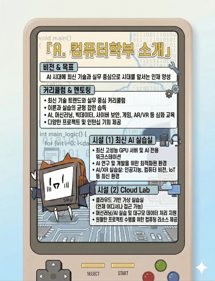 본문 시작 홈으로 학부활동 학부소개 학부활동 교육과정 커뮤니티 학부생활 입학안내 홈페이지가이드 학부갤러리 학부행사 학생회 활동 전공 동아리 학부갤러리 학부갤러리 페이스북 트위터 프린트 2026년 컴퓨터학부 소개 컴퓨터학부 229 2026-03-24 2026학년도 컴퓨터학부를 소개부터 학교 생활에 필요에 대한 가이드까지 안내해드립니다 목록 이전2026학년 신입생 환영회 다음 IT 에서 AI로, "AI융합대학" 으로 바뀌었습니다. 담당부서 : 컴퓨터학부 담당자 : - 연락처 : 043-649-1272 최종수정일 : 2024-10-26 만족도조사 만족도 조사 이 페이지에서 제공하는 정보에 대하여 만족하시나요? 매우만족 만족 보통 불만족 매우불만족
