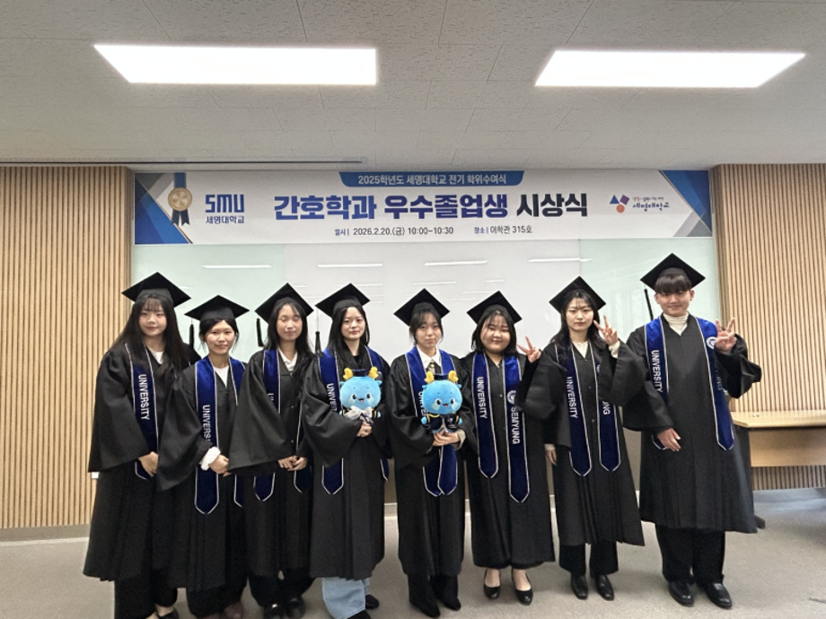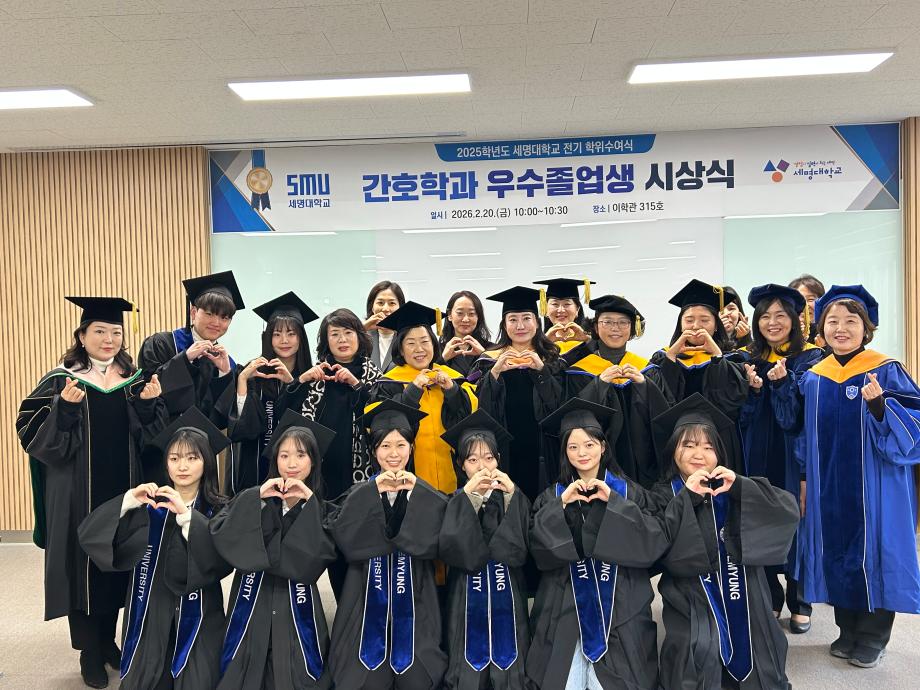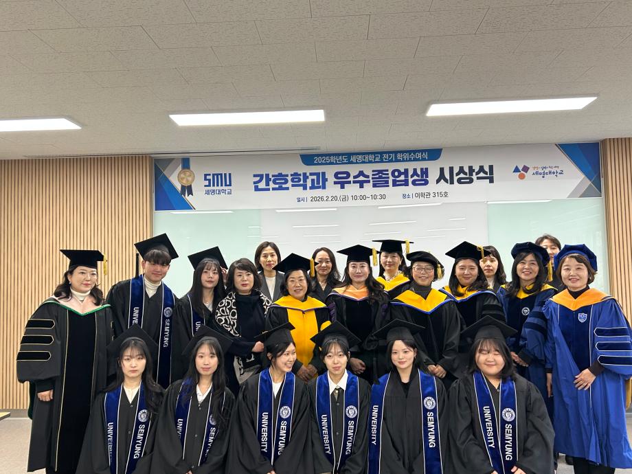 본문 시작 홈으로 커뮤니티 학과소개 교수소개 교육과정 학과소식 학과특성화 사업 커뮤니티 홈페이지가이드 포토갤러리 학사일정 포토갤러리 학생회 학과동아리 학과 취업정보 동창회 학과운영개선의견 발전기금 포토갤러리 페이스북 트위터 프린트 2025학년도 세명대학교 간호학과 학위수여식🎓 간호학과 653 2026-02-23 세명대학교 간호학과 졸업생들은 2025학년도 학위수여식을 통해 4년간의 배움과 성장을 마무리하고 새로운 출발선에 섰습니다. 빛나는 졸업의 순간이 담긴 현장이 궁금하시다면, 아래 링크를 클릭해 주세요. 👉 [학위수여식 현장 보러가기] https://blog.naver.com/nursing_smu_official/224192111491 목록 이전세명대학교 간호학과 제66회 간호사 국가시험 임장지도 실시 다음 2026학년도 꿈설계학기 담당부서 : 간호학과 담당자 : - 연락처 : 043-649-1357 최종수정일 : 2024-10-26 만족도조사 만족도 조사 이 페이지에서 제공하는 정보에 대하여 만족하시나요? 매우만족 만족 보통 불만족 매우불만족