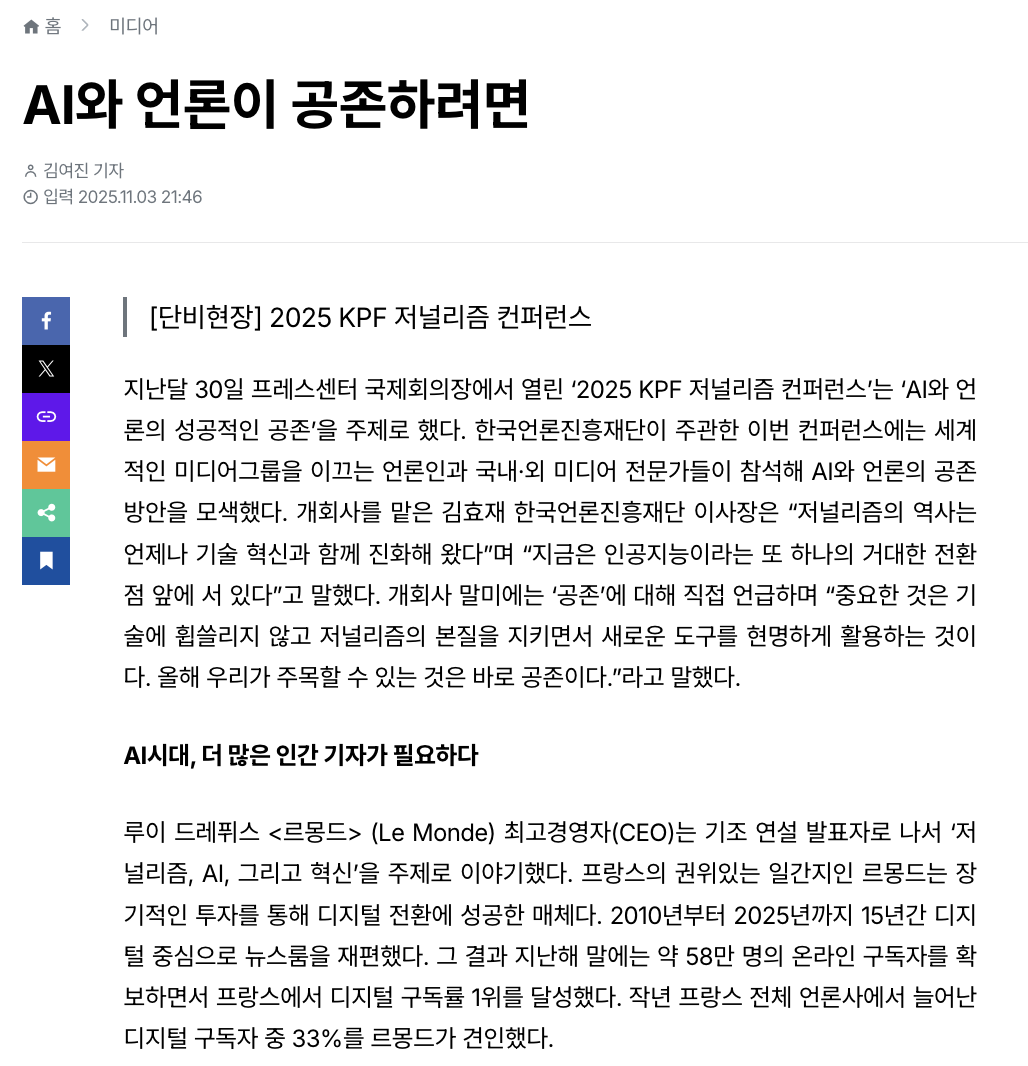지난달 30일 프레스센터 국제회의장에서 열린 ‘2025 KPF 저널리즘 컨퍼런스’는 ‘AI와 언론의 성공적인 공존’을 주제로 했다.