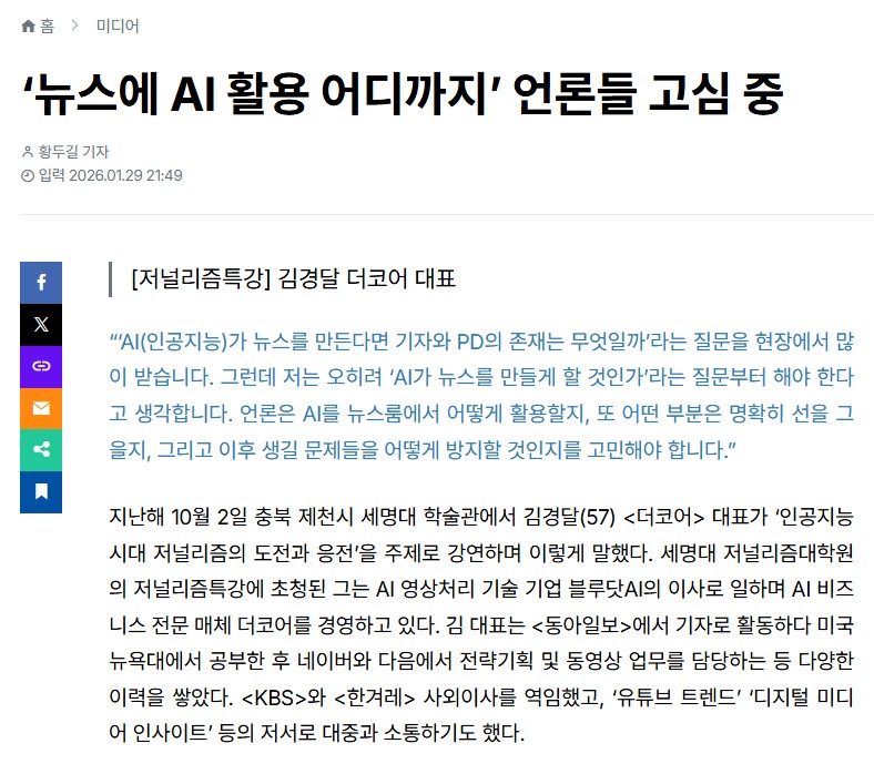 지난해 10월 2일 충북 제천시 세명대 학술관에서 김경달(57) <더코어> 대표가 ‘인공지능 시대 저널리즘의 도전과 응전’을 주제로 강연하며 이렇게 말했다. 세명대 저널리즘대학원의 저널리즘특강에 초청된 그는 AI 영상처리 기술 기업 블루닷AI의 이사로 일하며 AI 비즈니스 전문 매체 더코어를 경영하고 있다. 김 대표는 <동아일보>에서 기자로 활동하다 미국 뉴욕대에서 공부한 후 네이버와 다음에서 전략기획 및 동영상 업무를 담당하는 등 다양한 이력을 쌓았다. <KBS>와 <한겨레> 사외이사를 역임했고, ‘유튜브 트렌드’ ‘디지털 미디어 인사이트’ 등의 저서로 대중과 소통하기도 했다.