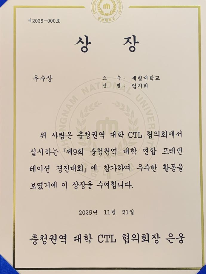 본문 시작 홈으로 매력적인 학과소개 매력적인 학과소개 흥미로운 교육과정 특별CC프로그램 We can 취업 따뜻한 커뮤니티 홈페이지가이드 지금 우리 광홍은 학과개요 학과연혁 교수소개 Wilco로 보는광고홍보학과 지금 우리 광홍은 지금 우리 광홍은 페이스북 트위터 프린트 25학번 엄지희_충청권역 대학 연합 프레젠테이션_우수상 광고홍보학과 131 2025-11-24 우리 광고홍보학과 25학번 엄지희 학생이 '제9회 충청권역 대학 연합 프레젠테이션 경진대회'에서 우수상을 수상했어요. ^^ 훌륭하고, 대견합니다. 진심으로 축하합니다. '기획 맛집' 세명대 광고홍보학과!!! '발표 맛집' 까지... 목록 이전2025-2학기 개강총회