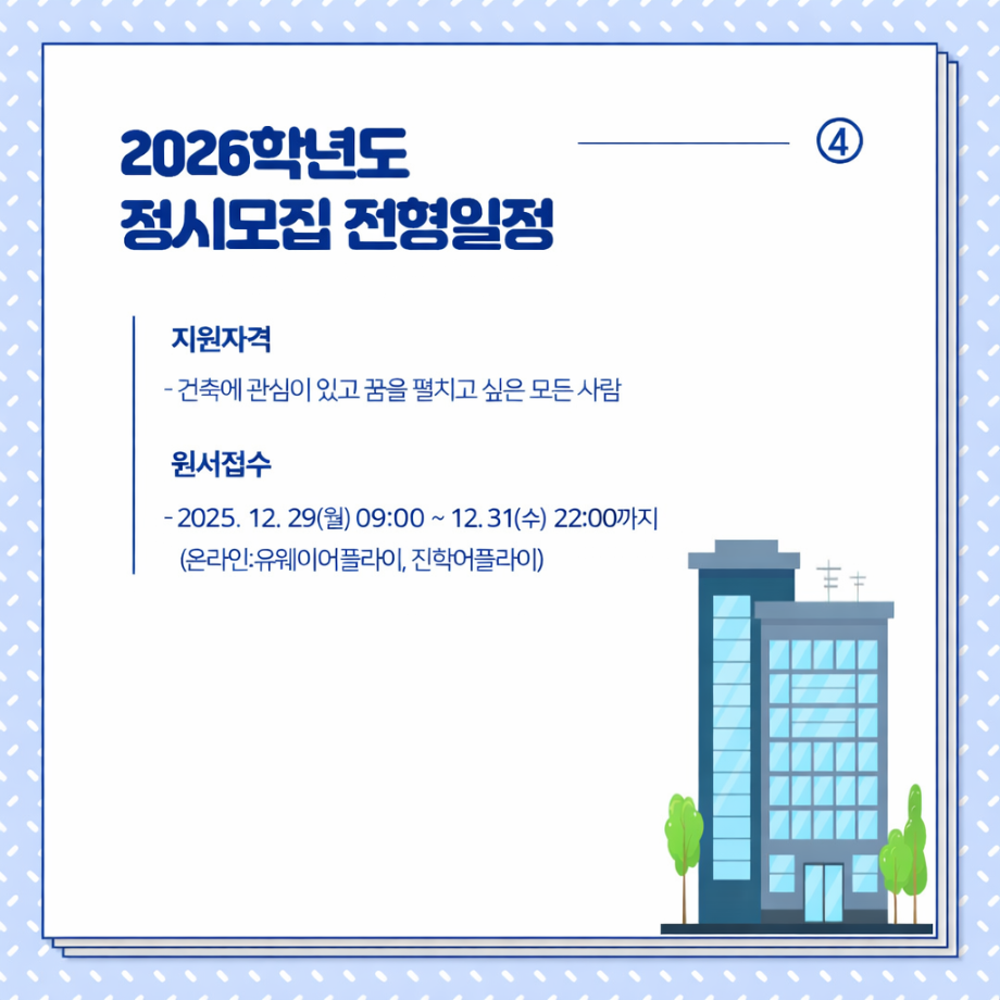 본문 시작 홈으로 커뮤니티 학과소개 교수소개 교육과정 학과 행사 및 활동 커뮤니티 홈페이지가이드 열린정보 학과일정 학과공지 채용정보 및 자료 열린정보 포토갤러리 먹거리, 즐길거리 포토갤러리 사진 사진 영상 사진 페이스북 트위터 프린트 사진 영상 [ 건축학과] 2026학년도 정시 원서접수(12.29~31) 건축학과 630 2025-12-30 목록 이전[2026 정시] 모집 안내 다음 2026학년도 정시모집 및 편입학 최초합격자 발표 만족도조사 만족도 조사 이 페이지에서 제공하는 정보에 대하여 만족하시나요? 매우만족 만족 보통 불만족 매우불만족