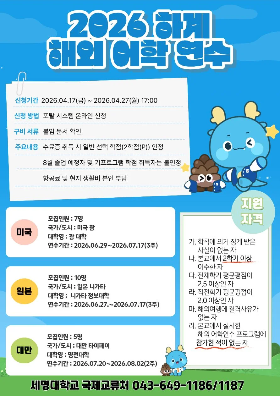 본문 시작 공지사항 세명소개 입학/취업 대학/대학원 학사지원 대학생활 연구/산학 기관/시설 SMU Story 소통·공감 학교기업 홈페이지가이드 일반공지 News@SMU 공지사항 보도자료 Media SMU 민송백일장 해카톤 경진대회 일반공지 페이스북 트위터 프린트 ✈️2026년 하계 해외 어학연수 선발 공고📖 국제교류팀 조회:99 등록일:2026-04-16 [붙임1] 2026 해외어학연수 선발공고.pdf [붙임2] 해외어학연수 온라인 지원방법.pdf [붙임3] 어학연수 신청서.hwp [붙임4] 개인정보 제공 및 활용 동의서.hwp [붙임5]해외어학연수생 서약서.hwp 오픈채팅 문의 : https://open.kakao.com/o/s3nf1uqi * 오픈채팅은 평일 09:00 ~ 18:00 에 답변드립니다. * 신청 후 유선(649-1186/1187) 혹은 오픈카톡으로 신청 확인 ★필수★ 목록 담당부서 : 세명대학교 담당자 : 세명대학교 연락처 : 043-645-1125 최종수정일 : 2024-10-26 만족도조사 만족도 조사 이 페이지에서 제공하는 정보에 대하여 만족하시나요? 매우만족 만족 보통 불만족 매우불만족