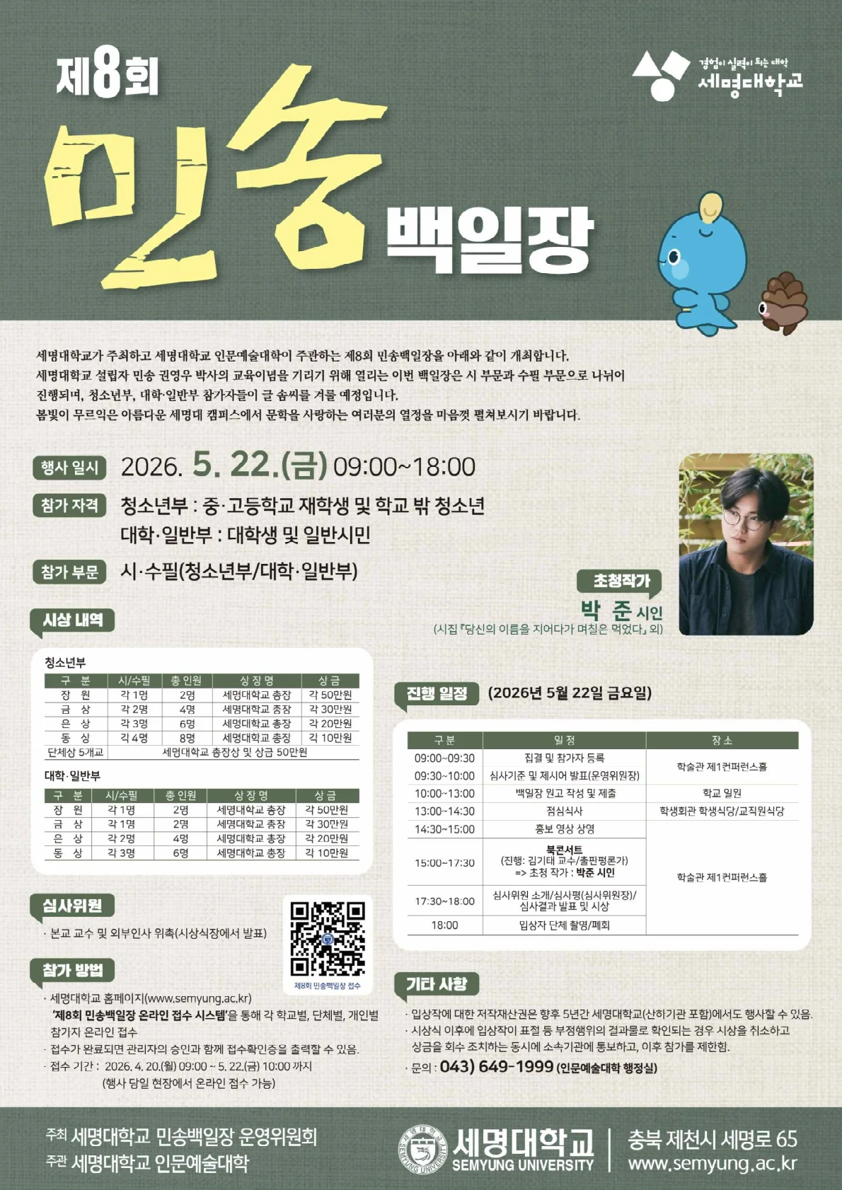 본문 시작 공지사항 세명소개 입학/취업 대학/대학원 학사지원 대학생활 연구/산학 기관/시설 SMU Story 소통·공감 학교기업 홈페이지가이드 일반공지 News@SMU 공지사항 보도자료 Media SMU 민송백일장 해카톤 경진대회 일반공지 페이스북 트위터 프린트 제8회 민송백일장 개최 안내 총무팀 조회:29 등록일:2026-04-23 제8회민송백일장 안내 포스터.pdf 목록 담당부서 : 세명대학교 담당자 : 세명대학교 연락처 : 043-645-1125 최종수정일 : 2024-10-26 만족도조사 만족도 조사 이 페이지에서 제공하는 정보에 대하여 만족하시나요? 매우만족 만족 보통 불만족 매우불만족