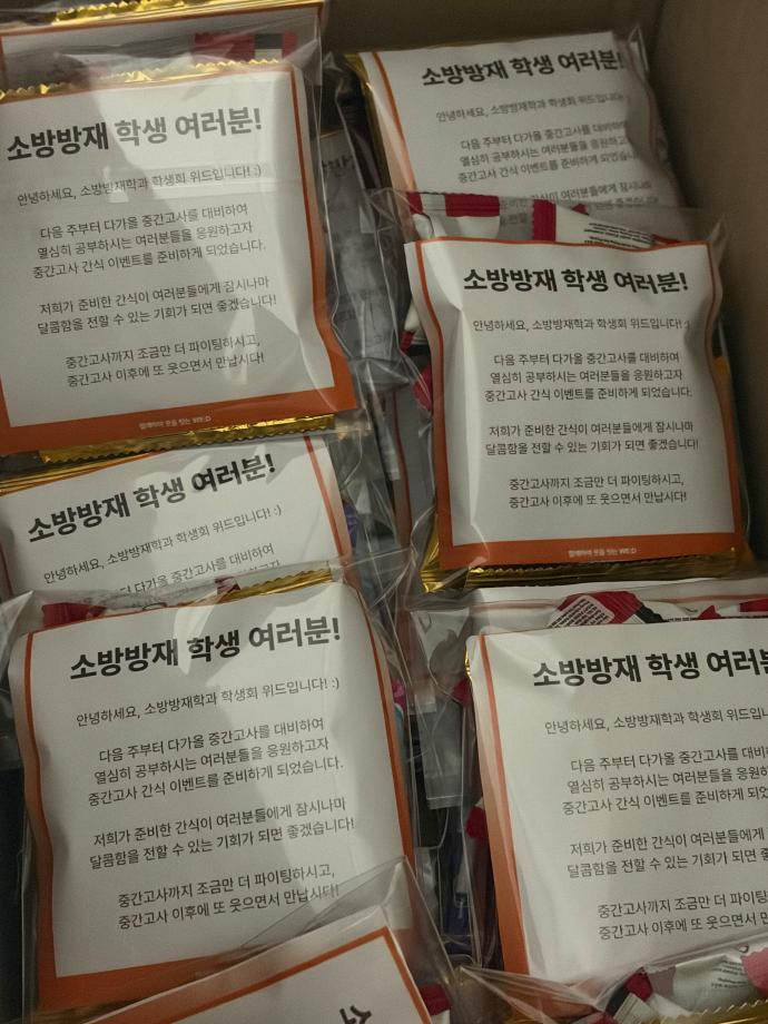 본문 시작 홈으로 커뮤니티 학과소개 교수소개 전공과정 커뮤니티 홈페이지가이드 학과행사 학과공지 채용정보 학사일정 학과행사 동아리 소방방재학과의 자랑 궁금합니다 수험생 Q&A 학과행사 페이스북 트위터 프린트 2026학년도 1학기 중간고사 간식 이벤트 소방방재학과 18 2026-04-14 2026년 4월 14일 화요일 안녕하세요, 세명대학교 소방방재학과 제21대 학생회 위드입니다! 공학관 209호 앞에서 17시 30분부터 18시까지 2026학년도 1학기 중간고사 간식 이벤트를 진행하였습니다! 수령하지 못하신 분들은 15일에 걸쳐 수령하실 수 있도록 도와드릴 예정입니다. 중간고사까지 다들 파이팅 하시고 좋은 결과 있으시길 바라겠습니다! 목록 이전캡스톤디자인 작품 중앙시장 번영회에 기증 담당부서 : 소방방재학과 담당자 : - 연락처 : 043-649-1787 최종수정일 : 2024-10-26 만족도조사 만족도 조사 이 페이지에서 제공하는 정보에 대하여 만족하시나요? 매우만족 만족 보통 불만족 매우불만족