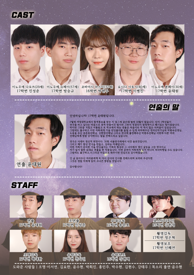 본문 시작 홈으로 커뮤니티 학과소개 교수소개 학과과정 커뮤니티 작품DB 서울대학로 민송아트홀 홈페이지가이드 사진자료실 학과공지 전공자료실 사진자료실 사진자료실 페이스북 트위터 프린트 [공연영상학과] 1학년 하계 워크숍 "가을 반딧불이" 공연영상학과 10558 2017-12-11 - 공연일시: 2017년 10월 11일 오후 7시 태양아트홀 - 정의신 作 - 지도교수: 이정하 - 학생연출: 윤태원 - 배우: 박현주, 진성준, 이병진, 방승규, 윤태원 - 포스터디자인,촬영: 김한정 - 음향디자인,OP: 강현택 - 조명디자인,OP: 전다린, 배대환 - 스텝: 송준호, 정은혁, 신혜연 목록 이전[공연영상학과] 2학년 하계 워크숍 '베니스의 상인' 다음 세명대학교 공연영상학과 제 10회 졸업공연 '트루 웨스트' 담당부서 : 공연영상학과 담당자 : - 연락처 : 043-649-1429 최종수정일 : 2024-10-26 만족도조사 만족도 조사 이 페이지에서 제공하는 정보에 대하여 만족하시나요? 매우만족 만족 보통 불만족 매우불만족