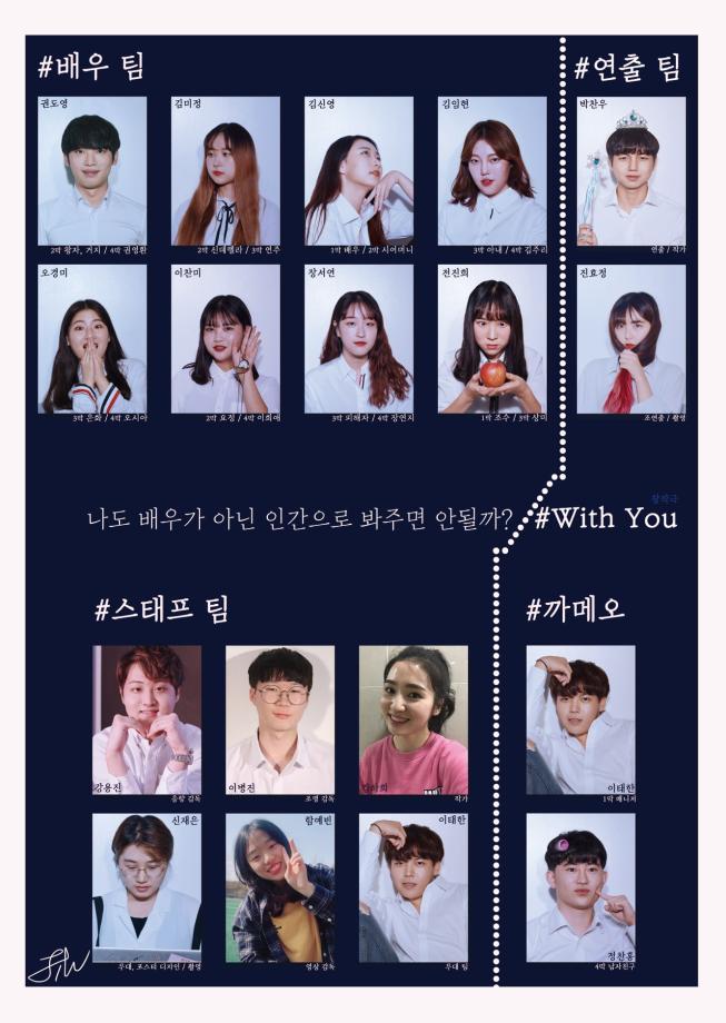 본문 시작 홈으로 커뮤니티 학과소개 교수소개 학과과정 커뮤니티 작품DB 서울대학로 민송아트홀 홈페이지가이드 사진자료실 학과공지 전공자료실 사진자료실 사진자료실 페이스북 트위터 프린트 [공연영상학과] 2018년 하계프로젝트 창작극 #With you 공연영상학과 7801 2018-10-04 하계프로젝트 - 창작극 "#With you" - 공연일시: 2018년 10월 4일 오후 7시 태양아트홀 - 연출/작가: 박찬우 - 조연출: 진효정 - 작가: 김하희 - 무대감독: 이해창 - 무대/포스터디자인: 신재은 - 조명감독: 이병진 - 음향오퍼: 강용진 - 배우: 권도영, 김미정, 김신영, 김임현, 이찬미, 오경미, 장서연, 전진희 목록 이전[공연영상학과] 제 11회 졸업작품 "야끼니쿠드래곤" 다음 [공연영상학과] 2018년 하계프로젝트 버스를놓치다 담당부서 : 공연영상학과 담당자 : - 연락처 : 043-649-1429 최종수정일 : 2024-10-26 만족도조사 만족도 조사 이 페이지에서 제공하는 정보에 대하여 만족하시나요? 매우만족 만족 보통 불만족 매우불만족
