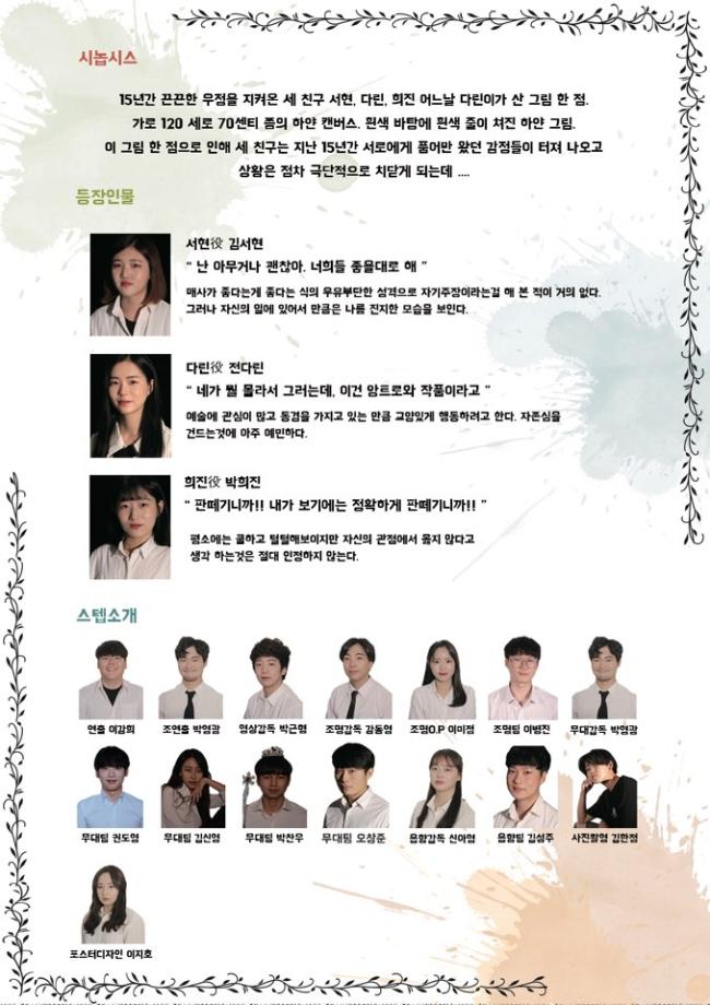 본문 시작 홈으로 커뮤니티 학과소개 교수소개 학과과정 커뮤니티 작품DB 서울대학로 민송아트홀 홈페이지가이드 사진자료실 학과공지 전공자료실 사진자료실 사진자료실 페이스북 트위터 프린트 [공연영상학과] 2018년 하계프로젝트 ART 공연영상학과 8152 2018-10-25 하계프로젝트 - "ART" - 연출: 이강희 - 조연출: 박영광 - 배우: 김서현, 전다린, 박희진 - 영상감독: 박근형 - 조명감독: 강동영 - 조명O.P: 이미정 - 조병팀: 이병진 - 무대감독: 박영광 - 무대팀: 권도영, 김신영, 박찬우, 오창준 - 음향감독: 신아영 - 음향팀: 김성주 - 사진촬영: 김한정 - 포스터디자인: 이지호 목록 이전[공연영상학과] 2018년 하계프로젝트 버스를놓치다 다음 [공연영상학과] 2018년 기초연기 발표 "처녀비행" 담당부서 : 공연영상학과 담당자 : - 연락처 : 043-649-1429 최종수정일 : 2024-10-26 만족도조사 만족도 조사 이 페이지에서 제공하는 정보에 대하여 만족하시나요? 매우만족 만족 보통 불만족 매우불만족