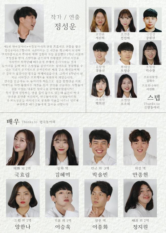 본문 시작 홈으로 커뮤니티 학과소개 교수소개 학과과정 커뮤니티 작품DB 서울대학로 민송아트홀 홈페이지가이드 사진자료실 학과공지 전공자료실 사진자료실 사진자료실 페이스북 트위터 프린트 [공연영상학과] 제1회 극동/연동 합동 프로젝트 "이름에게" 공연영상학과 6609 2019-06-07 작가/연출 : 정성운 조연출 : 서진희, 전진희 극장장 : 강필진 음향장 : 강용진 무대장 : 오창준 조명장 : 박수현, 박희진, 조소혜 프로필촬영 : 김희수 프로필디자인 : 서진희 '태화'외 7역 : 국효림 '상화' 역 : 김혜미 '민규'외 3역 : 박솔빈 '희성' 역 : 안종현 '도원'외 1역 : 양한나 '기훈'외 1역 : 이승욱 '상현' 역 : 이종화 '태희'외 2역 : 정지원 Thanks to, 극장동아리/연극동아리 목록 이전[공연영상학과] 2019 성년의 날 다음 [공연영상학과] 2019년 1학기 뮤지컬제작실습 "지하철 1호선" 담당부서 : 공연영상학과 담당자 : - 연락처 : 043-649-1429 최종수정일 : 2024-10-26 만족도조사 만족도 조사 이 페이지에서 제공하는 정보에 대하여 만족하시나요? 매우만족 만족 보통 불만족 매우불만족