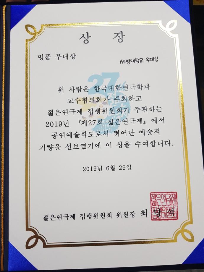 본문 시작 홈으로 커뮤니티 학과소개 교수소개 학과과정 커뮤니티 작품DB 서울대학로 민송아트홀 홈페이지가이드 사진자료실 학과공지 전공자료실 사진자료실 사진자료실 페이스북 트위터 프린트 [공연영상학과] 제 27회 젊은연극제 무대상 수상 공연영상학과 6137 2019-06-29 2019년 6월 29일, 제 27회 젊은연극제 폐막식과 시상식이 서울 대학로에서 진행되었습니다. 폐막식과 시상식에는 행사를 위해 힘써주신 관계자분들과 각 학교에 대표수상자들이 자리를 빛내주었는데요, 이날, 작품의 무대감독이었던 오창준 학생이 대표수상자로써 명품무대상을 수상하는 영광을 얻게 되었습니다. 젊은연극제 참가를 위해 애써주신 담당교수님들과, 학과생 여러분들. 모두들 고생많으셨고, 수상을 진심으로 축하드립니다! 목록 이전[공연영상학과] 제 27회 젊은연극제 참가작 " 니 부모 얼굴이 보고싶다 " 다음 [공연영상학과] JTBC 드라마 '우아한 친구들' 촬영지 제공 담당부서 : 공연영상학과 담당자 : - 연락처 : 043-649-1429 최종수정일 : 2024-10-26 만족도조사 만족도 조사 이 페이지에서 제공하는 정보에 대하여 만족하시나요? 매우만족 만족 보통 불만족 매우불만족