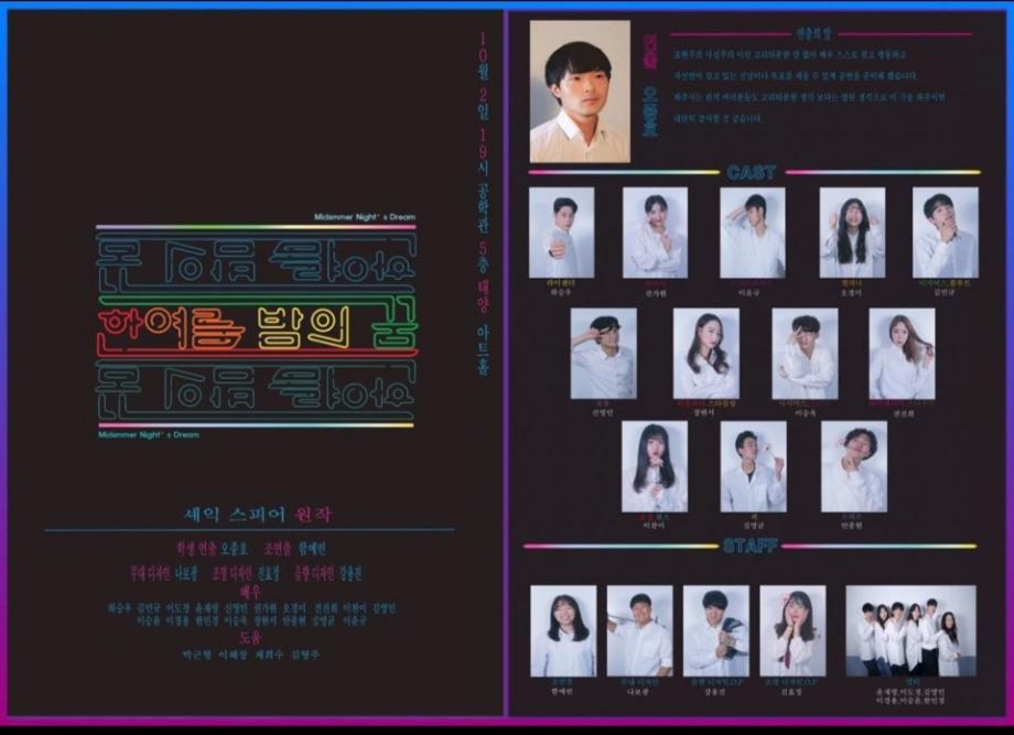 본문 시작 홈으로 커뮤니티 학과소개 교수소개 학과과정 커뮤니티 작품DB 서울대학로 민송아트홀 홈페이지가이드 사진자료실 학과공지 전공자료실 사진자료실 사진자료실 페이스북 트위터 프린트 [공연영상학과] 하계프로젝트 " 한여름밤의 꿈 " 공연영상학과 6301 2019-10-02 연출 : 오종호 조연출 : 함예빈 배우 : 하승우, 권가현, 이윤규, 오경미, 김민규, 신영민, 장현서, 이승욱, 전진희, 이찬미, 심명균, 안종현 무대디자인 : 나보광 조명디자인/O.P : 진효정 음향디자인/O.P : 강용진 도움주신분 : 박근형, 이해창, 채희수, 김형주 목록 이전[공연영상학과] 제 12회 졸업작품 "연기가 눈에 들어갈 때" 다음 [공연영상학과] 영상장비교육 담당부서 : 공연영상학과 담당자 : - 연락처 : 043-649-1429 최종수정일 : 2024-10-26 만족도조사 만족도 조사 이 페이지에서 제공하는 정보에 대하여 만족하시나요? 매우만족 만족 보통 불만족 매우불만족
