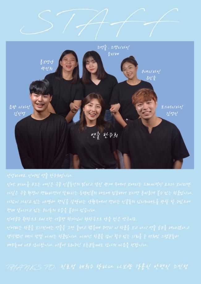 본문 시작 홈으로 커뮤니티 학과소개 교수소개 학과과정 커뮤니티 작품DB 서울대학로 민송아트홀 홈페이지가이드 사진자료실 학과공지 전공자료실 사진자료실 사진자료실 페이스북 트위터 프린트 [공연영상학과] 하계프로젝트 " 인어;바다를 부르는 여인 " 공연영상학과 5952 2019-10-15 연출 : 한주희 조연출 : 송지혜 배우 : 원성준, 임현자, 김수영, 이종화 무대디자인 : 유진솔 조명디자인: 송지혜 음향디자인: 김진영 포스터디자인: 김영진 홍보영상 : 곽민희 목록 이전[공연영상학과] 영상장비교육 다음 [공연영상학과] 2019학년도 졸업영화제 '어쩌다 졸업,' 담당부서 : 공연영상학과 담당자 : - 연락처 : 043-649-1429 최종수정일 : 2024-10-26 만족도조사 만족도 조사 이 페이지에서 제공하는 정보에 대하여 만족하시나요? 매우만족 만족 보통 불만족 매우불만족